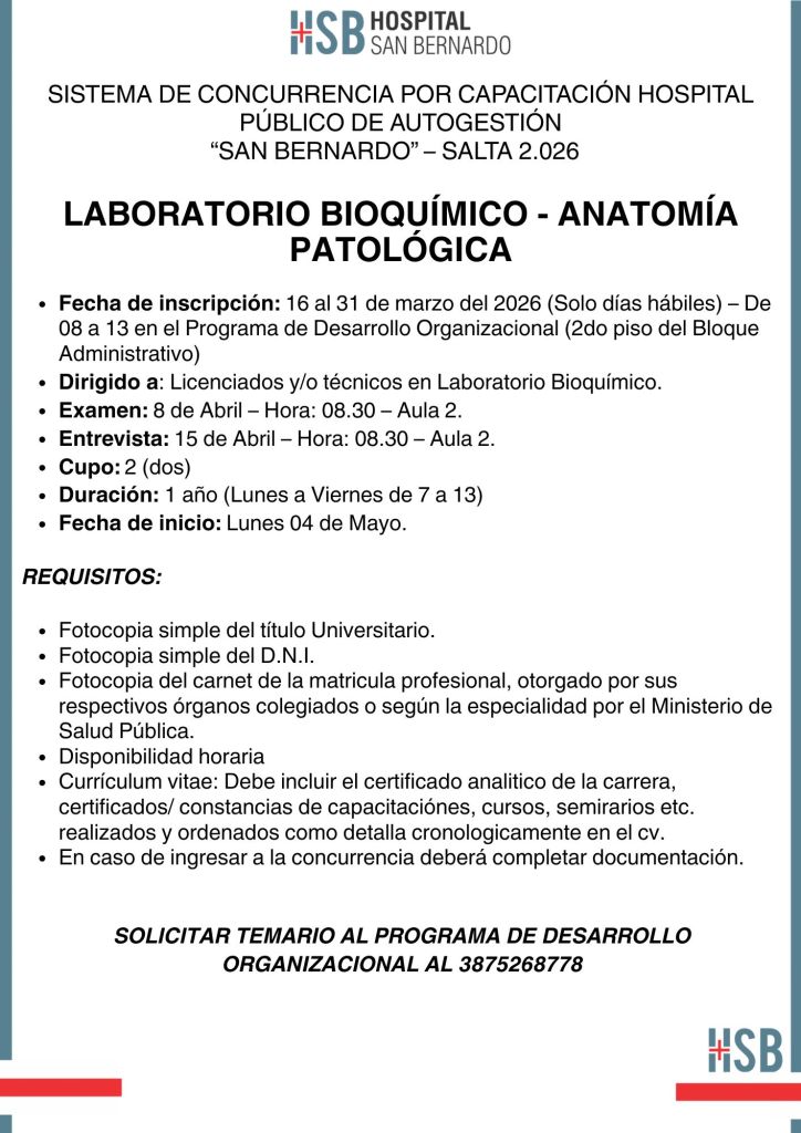 El Hospital San Bernardo informa que, del 16 al 31 de marzo, se habilitarán las inscripciones a la siguiente concurrencia: